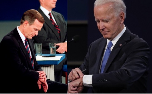 Biden repeats the 1992 mistake of George H.W. Bush in debate – looking at his watch while the camera is on. Trump has made mistakes, but Biden.should have known not to bring a watch on stage.