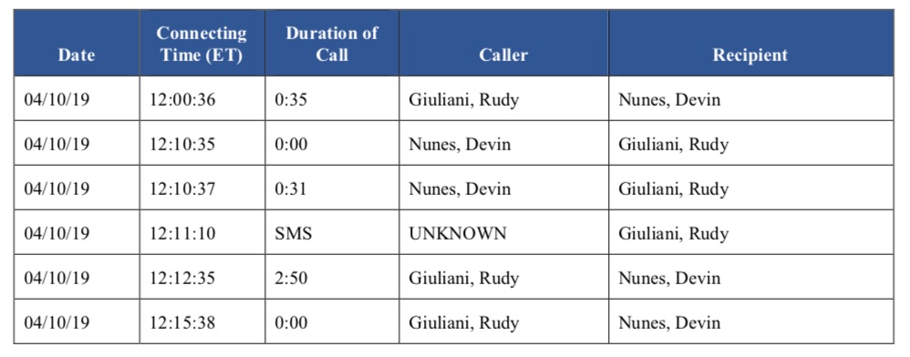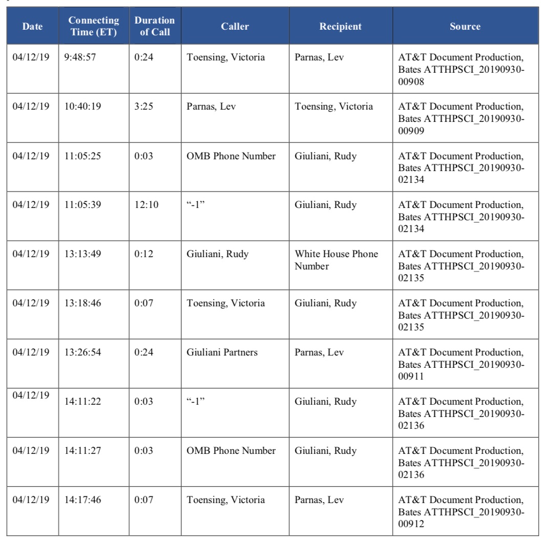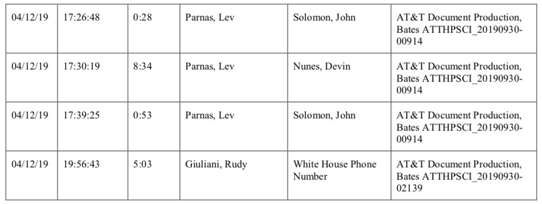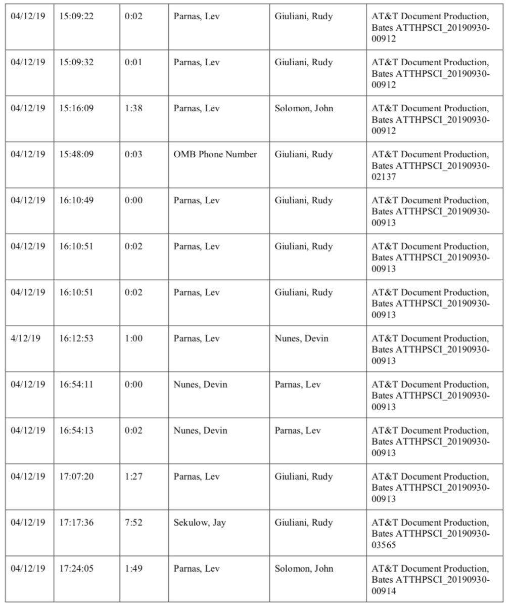 Another call log identifies “OMB Phone Number” as trying to call Giuliani back in April, in a chain listing calls that took place on the 12th, including calls between Lev Parnas and Victoria Toensing, Parnas and John Solomon, Parnas and Giuliani, Parnas and Devin Nunes, and Giuliani and a White House phone number. The call logs also show Giuliani and Nunes speaking two days prior. The impeachment report notes