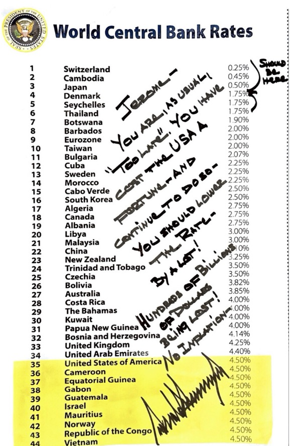 “Should be here,” Trump wrote on the list near the top 6 countries, where the rate is as low as .25 percent and 1.75 percent.