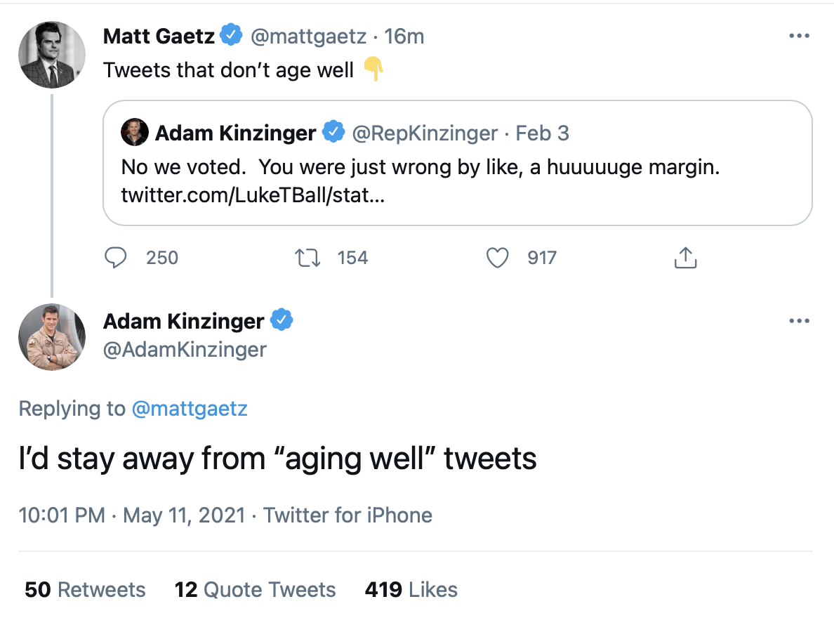 Kinzinger pushed back at Gaetz, “I’d stay away from ‘aging well’ tweets.”