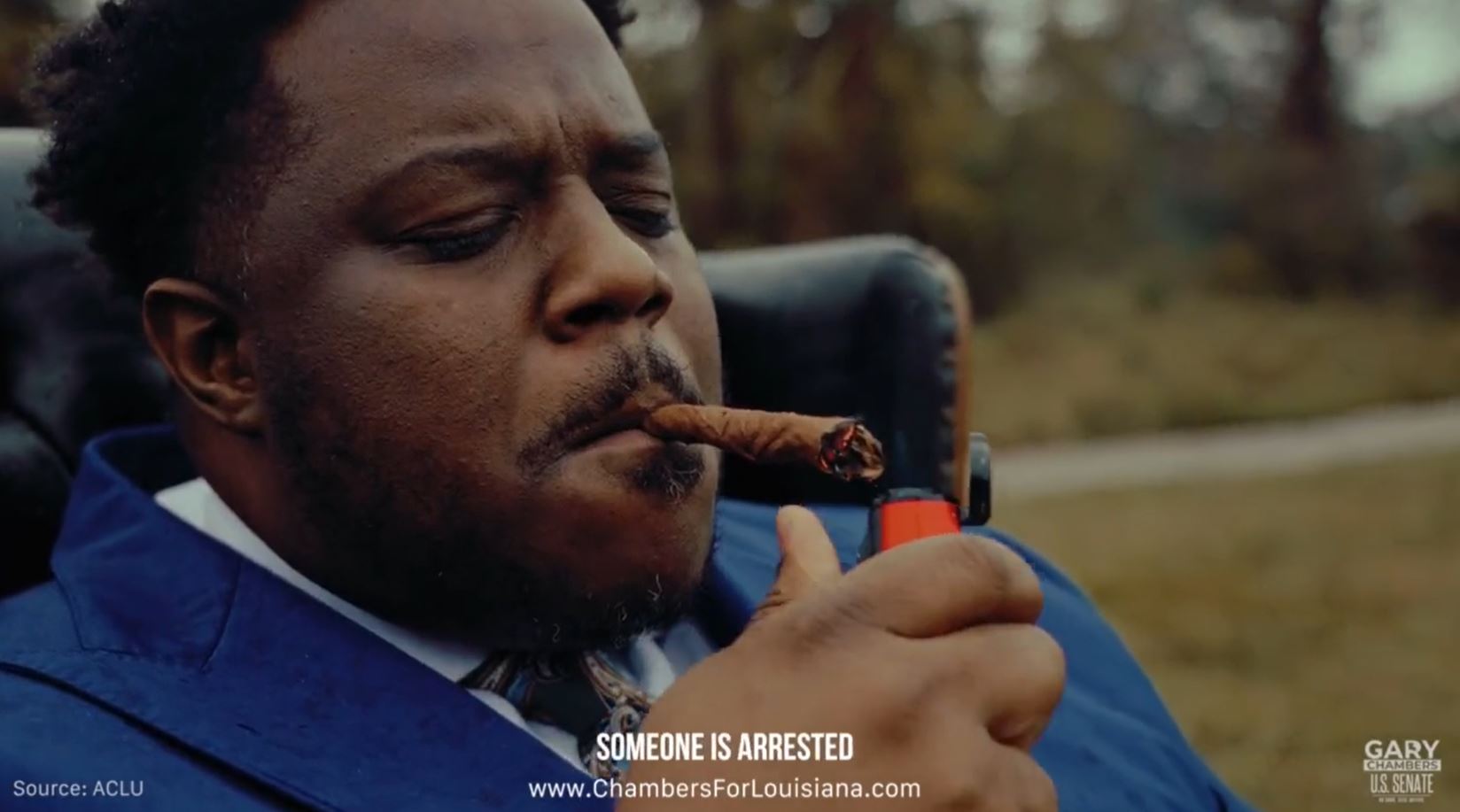 “Every 37 seconds someone is arrested for possession of marijuana,” Chamber says in a voice-over as the ad runs.