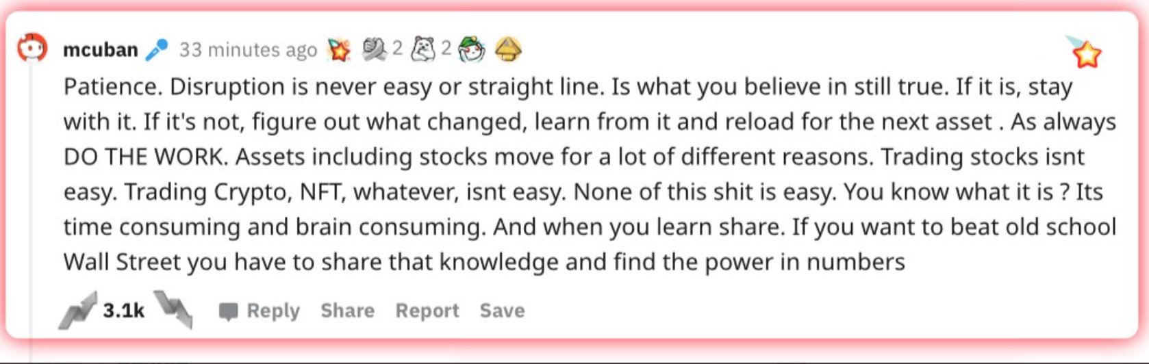 The remarks came as part of an impromptu call to the network after Cuban hosted an “Ask Me Anything” thread earlier in the day on Reddit’s “WallStreetBets,” the forum responsible for causing a surge in the price of stocks last week included GameStop. Cuban encouraged readers of the thread to be persistent in seeking to influence the market, writing, “If you want to beat old school Wall Street you have to share [your] knowledge and find the power in numbers.”