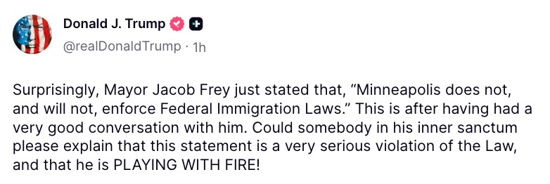 The president’s rebuke came just days after Trump said he had “a very good conversation” with the mayor and one day after Frey met with the president’s border czar Tom Homan alongside Minnesota Governor Tim Walz and senior state officials.