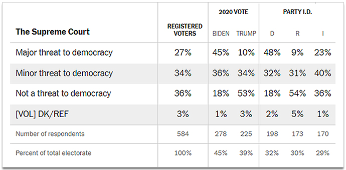 Among registered voters and likely voters, 59% see the mainstream media as a major threat and 24% a minor threat. That beats Trump, Biden, the Supreme Court, and the other answers.