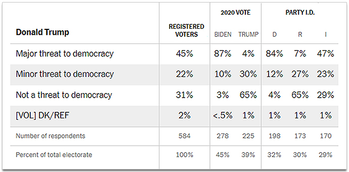 Registered voters have demonstrated in multiple recent polls a concern that democracy is under threat in the United States. But a new New York Times/Siena poll shows that the direction of that threat is not singular, or even partisan. In fact, among the voters who expressed that concern, more agreed the media was a threat than agreed on any other source individually, including President Joe Biden, ex-president Donald Trump, Republicans as a party, Democrats as a party, or even just the federal government generically.