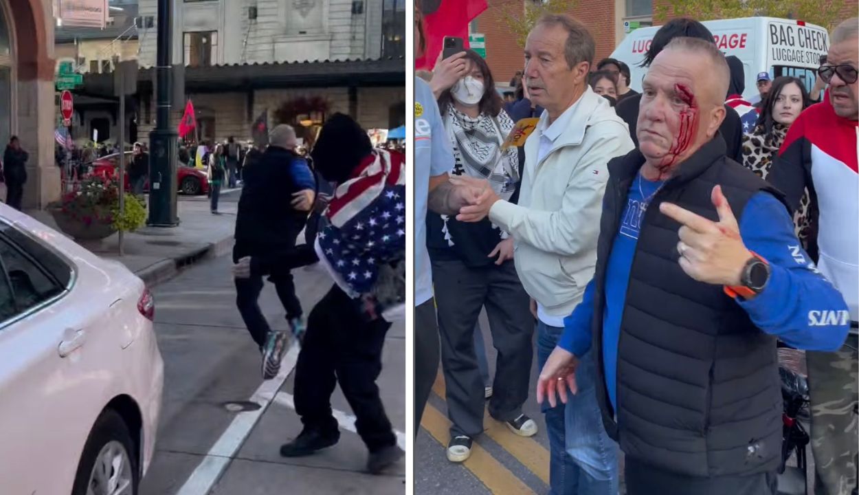He gets to his feet and continues running, only to be tripped by a protester with an American flag draped over his shoulders and then falls near the curb. He appeared to suffer a cut above his eye that was bleeding as protesters urged him to leave.