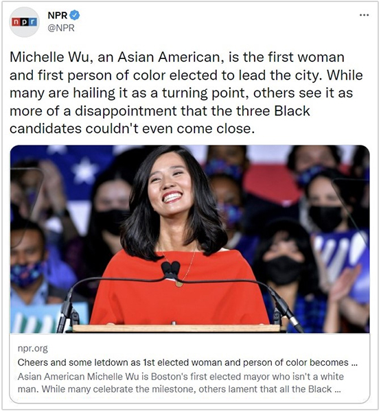 “Michelle Wu, an Asian American, is the first woman and first person color elected to lead the city,” NPR noted in an initial missive. “While many are hailing it as a turning point, others see it as more of a disappointment that the three Black candidates couldn’t even come close.”