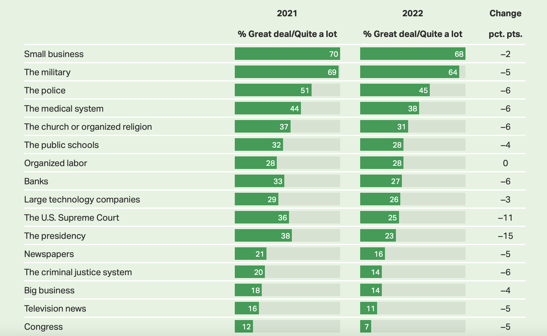 The most trusted institution in the country remained small businesses, although that confidence dropped from 70% in 2021 to 68% this year.