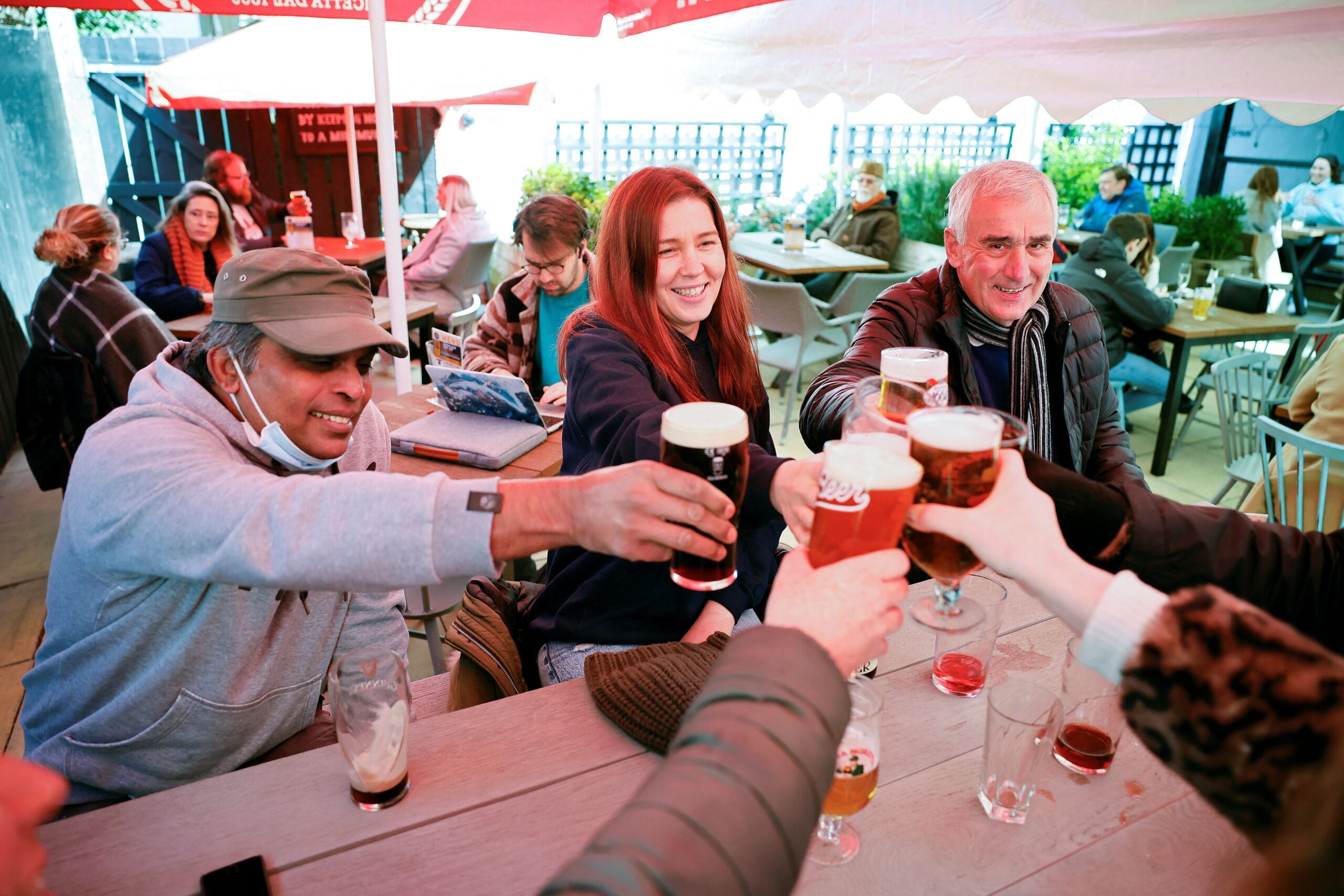 Customers enjoy drinks as the sit at an outside table at a re-opened pub in east London. Tolga Akmen/AFP/Getty Images.