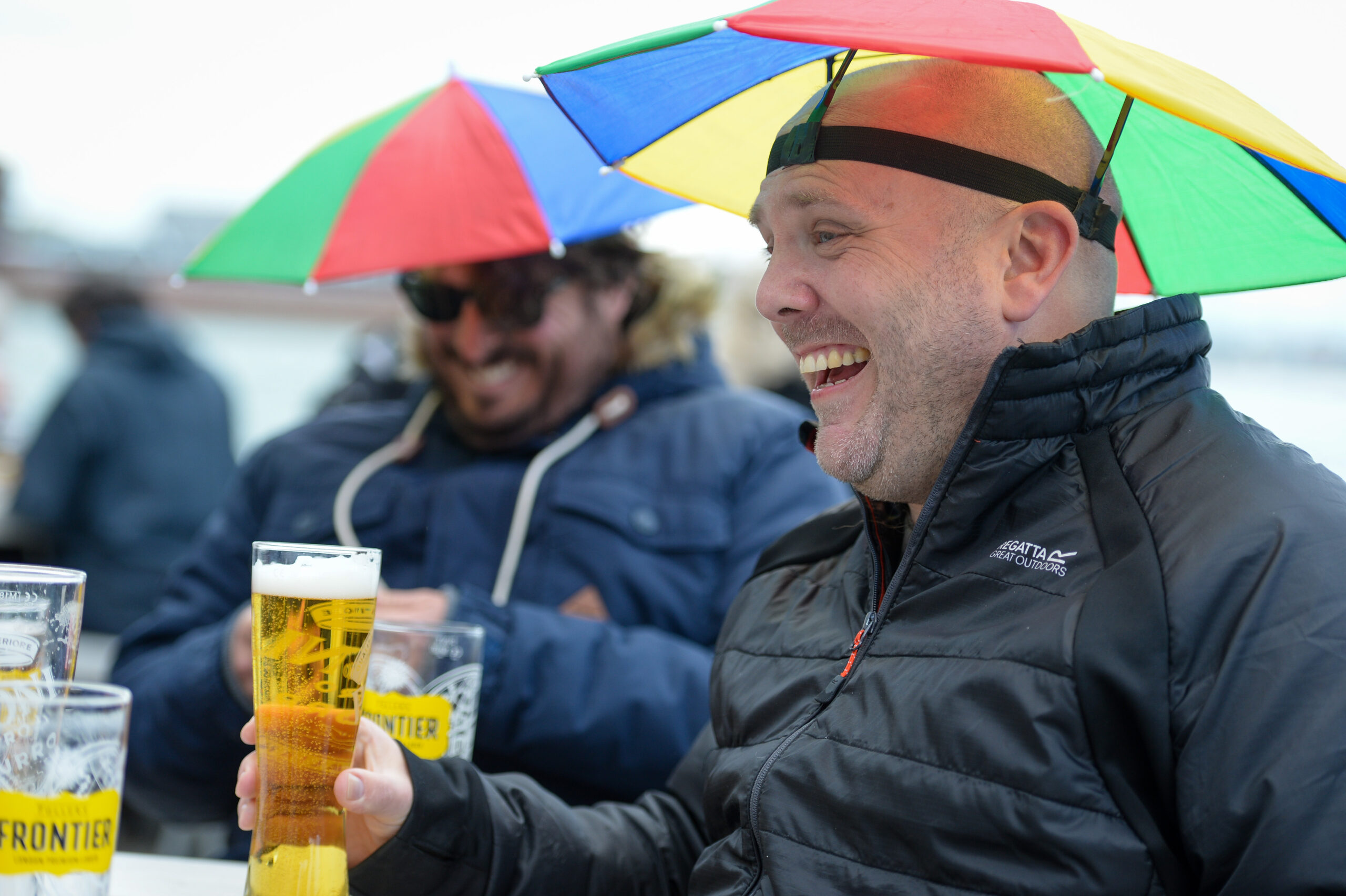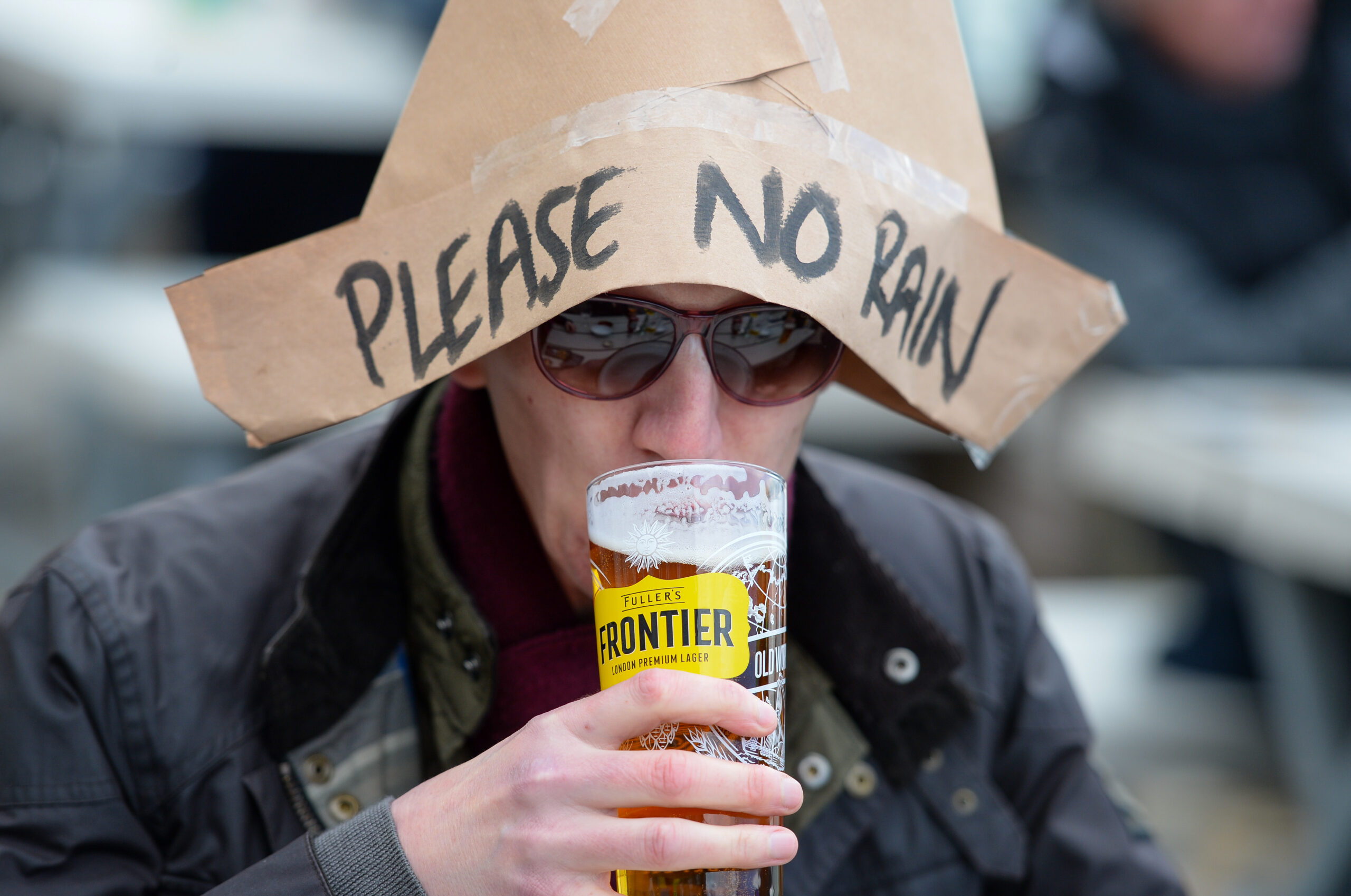 A man wears a ‘Please No Rain’ hat as he enjoys a drink outside at The Still & West pub at Spice Island. Finnbarr Webster/Getty Images.