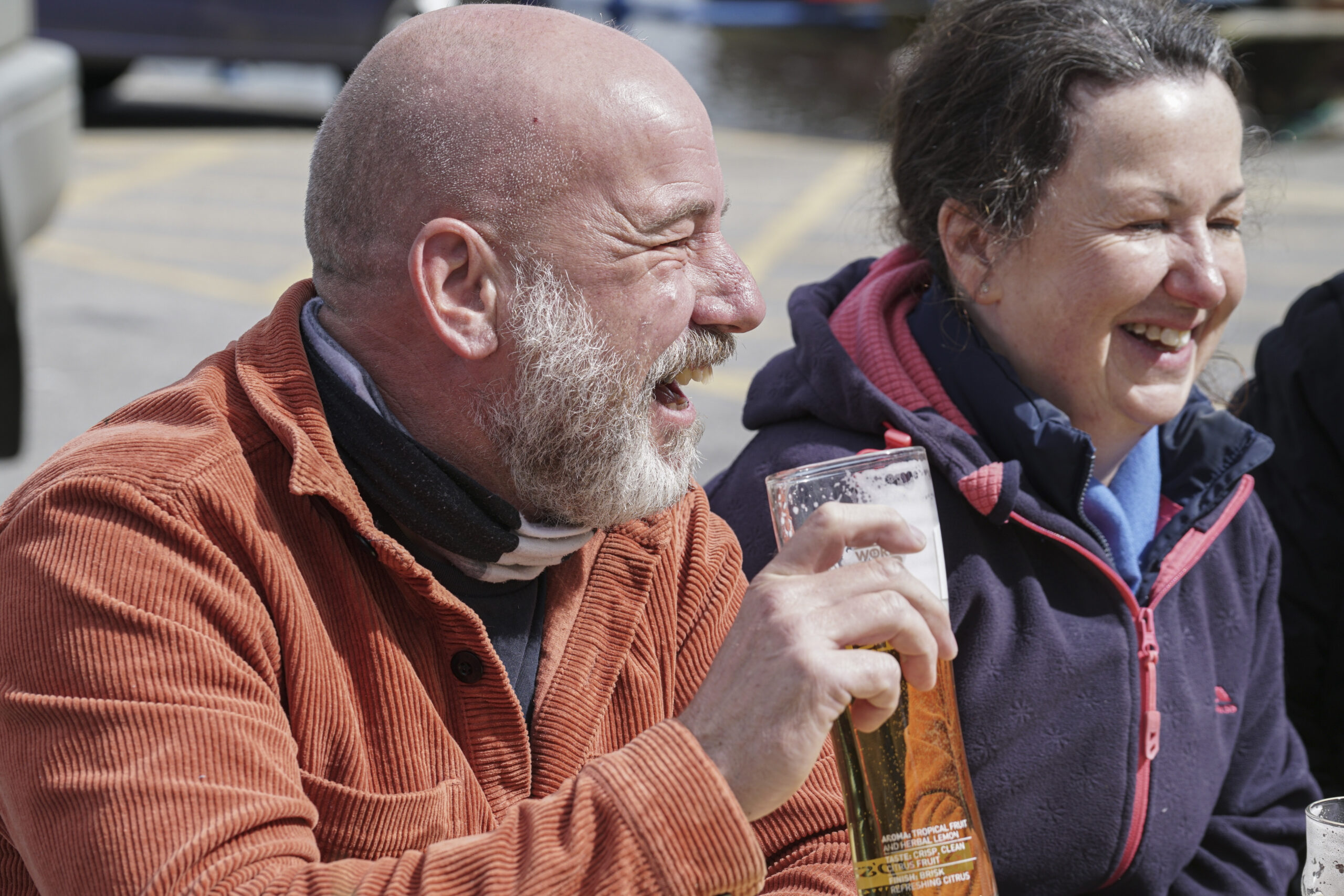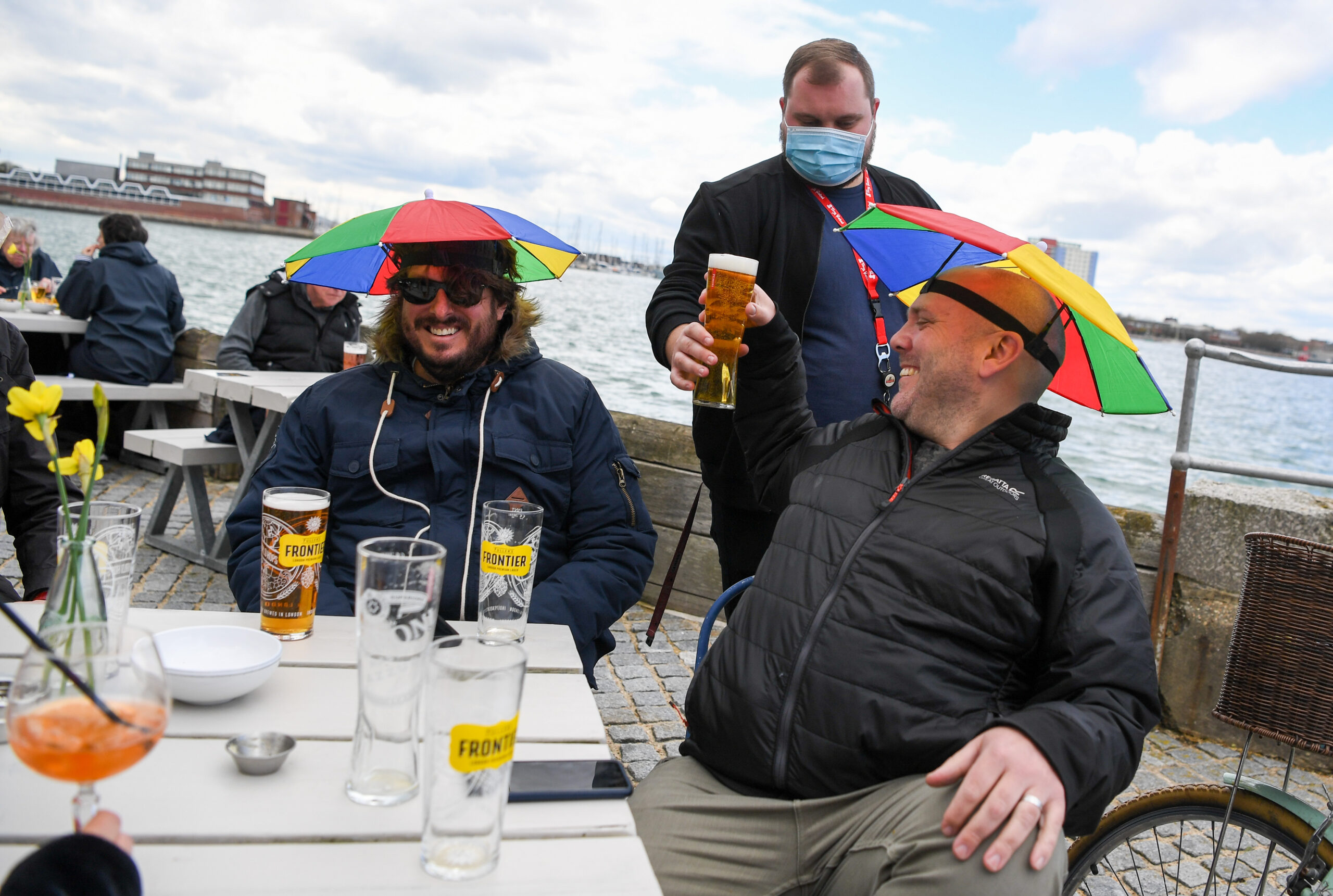 Members of the public enjoy a drink outside at The Still & West pub at Spice Island in Portsmouth, England. Finnbarr Webster/Getty Images.