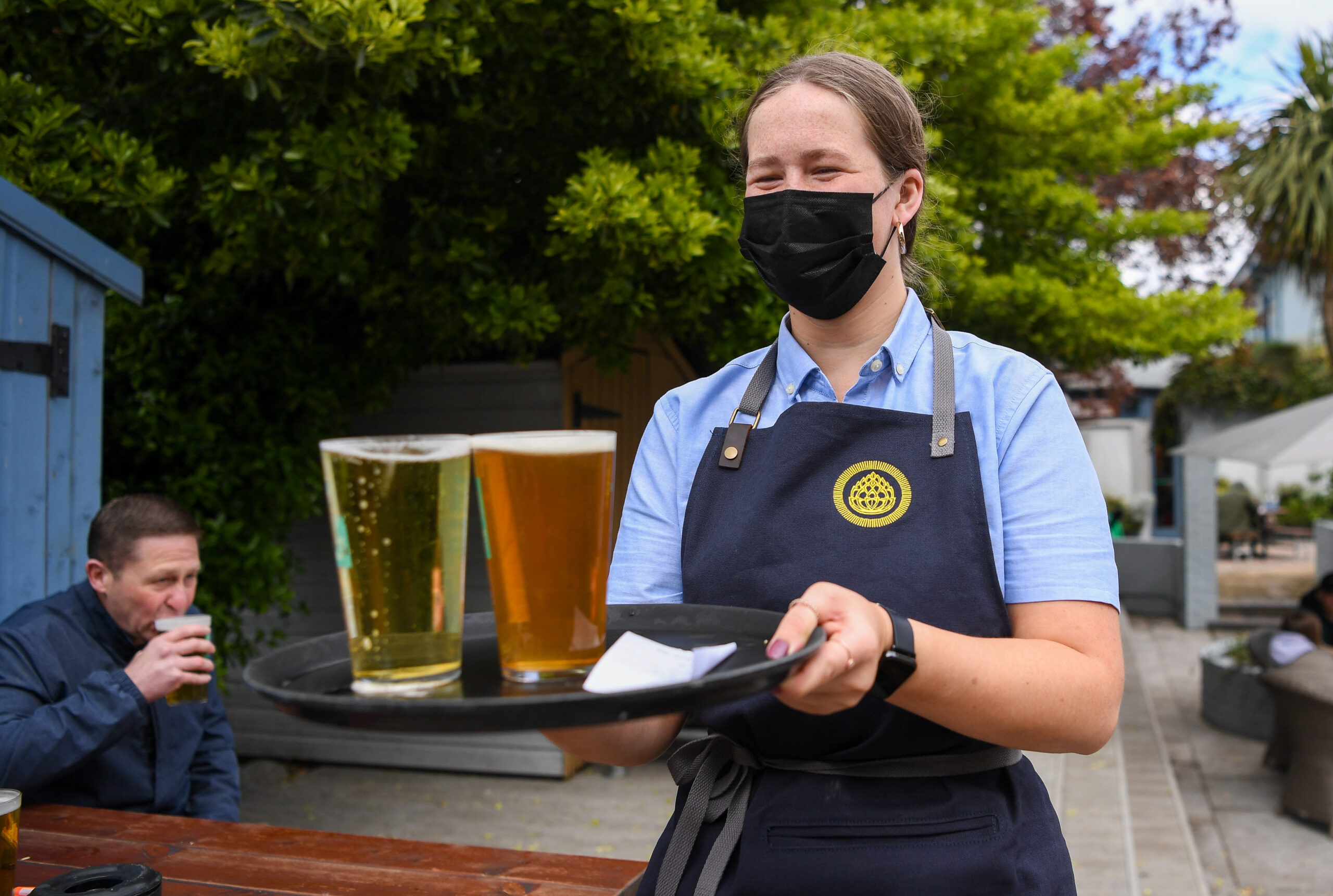 Staff serve drinks at Brewhouse & Kitchen pub at Southsea in Portsmouth, England. Finnbarr Webster/Getty Images.