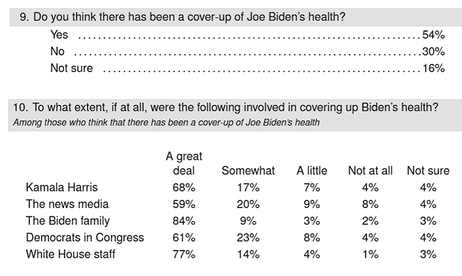 A majority of registered voters who answered a new survey said they believed there has been a “cover-up” of President Joe Biden’s health, and among those who said so, a whopping 92% believed presumptive nominee Vice President Kamala Harris was involved in that alleged cover-up to at least some degree – or about half of all respondents.