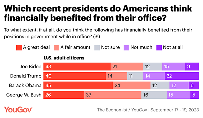 Most Americans approve of the Hunter Biden indictment, and more approve of the House impeachment inquiry into President Joe Biden than disapprove of it, in the latest Economist/YouGov poll. And perhaps more dramatically, only 9% of respondents said that Biden has not gained personal financial benefit “at all” as a result of being president.