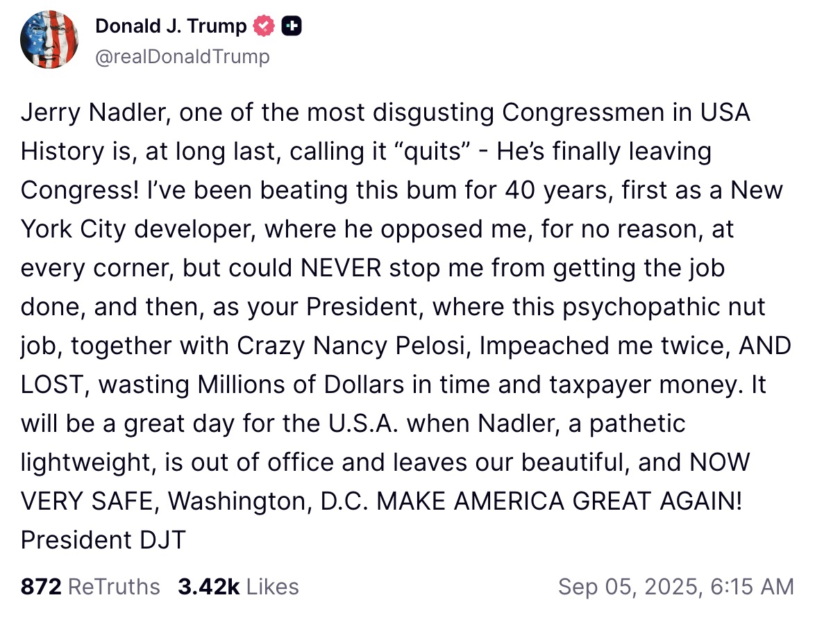 Jerry Nadler, one of the most disgusting Congressmen in USA History is, at long last, calling it “quits” – He’s finally leaving Congress! I’ve been beating this bum for 40 years, first as a New York City developer, where he opposed me, for no reason, at every corner, but could NEVER stop me from getting the job done, and then, as your President, where this psychopathic nut job, together with Crazy Nancy Pelosi, Impeached me twice, AND LOST, wasting Millions of Dollars in time and taxpayer money. It will be a great day for the U.S.A. when Nadler, a pathetic lightweight, is out of office and leaves our beautiful, and NOW VERY SAFE, Washington, D.C. MAKE AMERICA GREAT AGAIN! President DJT