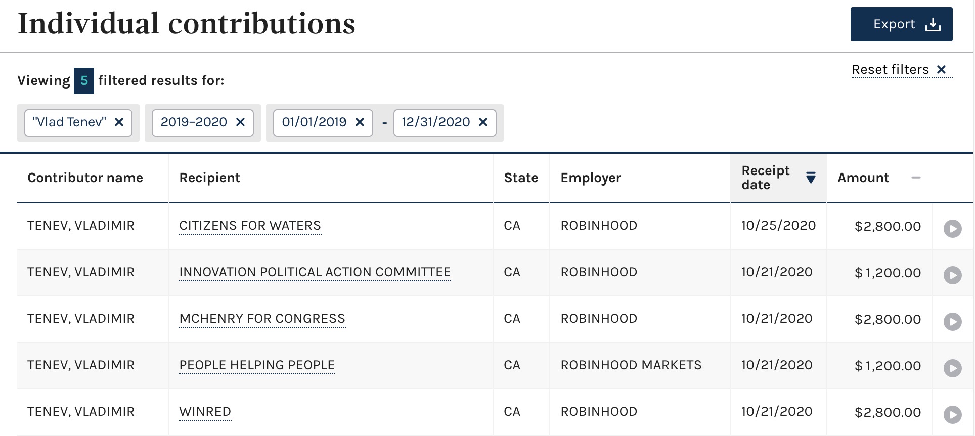 Robinhood CEO Vladimir Tenev contributed the maximum amount allowed under federal law last year to leaders of the House Finance Committee, according to federal records.