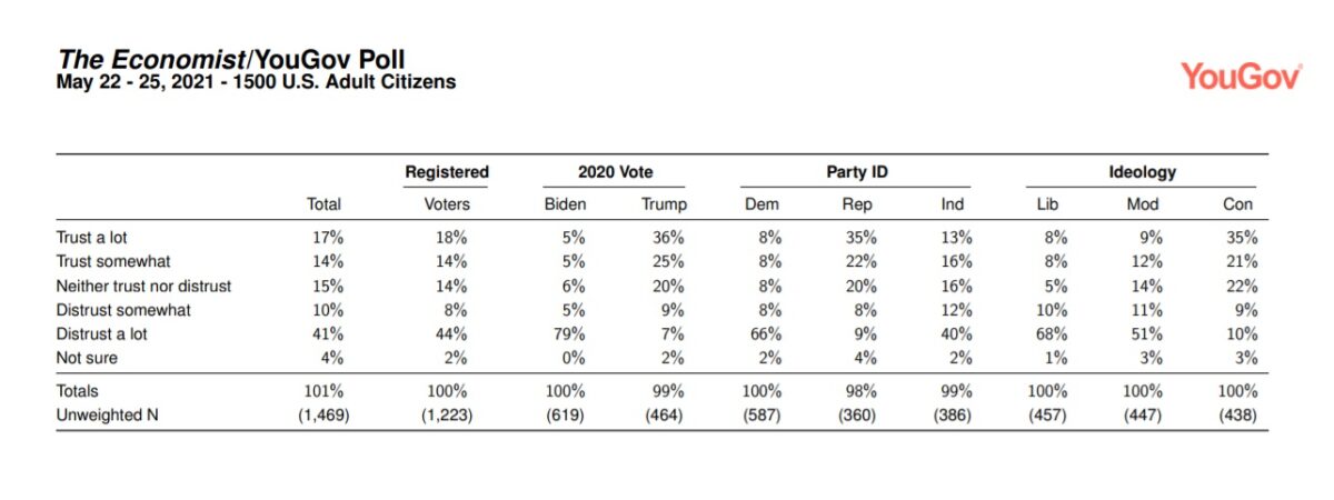 Trump was by far the least trusted among all respondents to that poll at just 29 percent, including 6 percent of Democrats and 29 percent of Independents. But among Republicans, a whopping 66 percent said they trust Trump “a lot” or “somewhat” for medical advice.