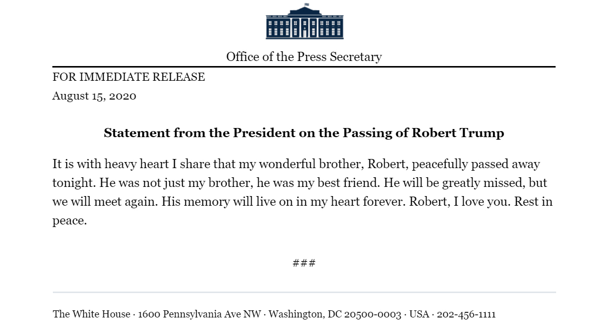 “It is with heavy heart I share that my wonderful brother, Robert, peacefully passed away tonight,” President Trump says in his statement. “He was not just my brother, he was my best friend. He will be greatly missed, but we will meet again. His memory will live on in my heart forever. Robert, I love you. Rest in peace.”