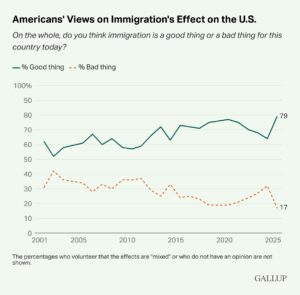 Gallup also found “record-high 79%” of Americans calling immigration a good thing for the country (up from 64% last year) and a “record-low 17%” saying they see it as a bad thing.