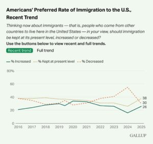 According to Gallup’s previous polls, support for reducing immigration hit 55% in 2024 (the highest peak this century since the months in the wake of the September 11, 2001 terrorist attacks) but has now “dropped by nearly half to 30%.”