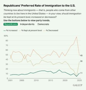 Republicans are the only partisan category “still showing at least plurality support for reducing immigration,” reported Gallup, but the drop in support for reducing immigration was the largest in this group — down a staggering 40 points in just a year, from 88% to 48%.