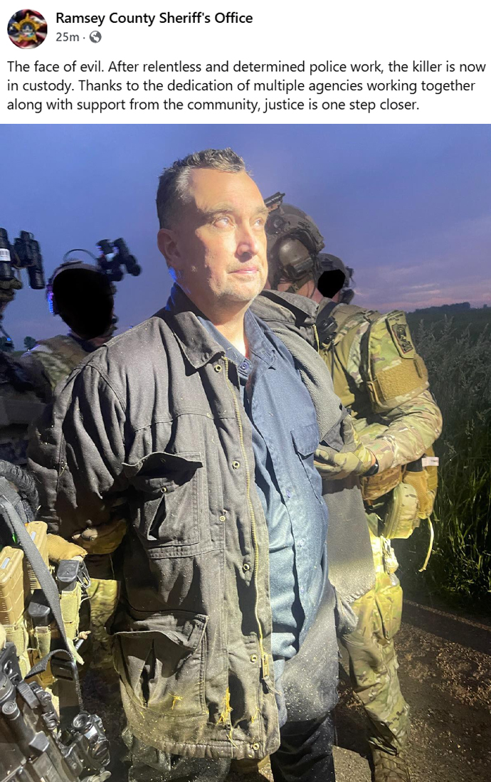 ‘The Face of Evil’: Ramsey County Sheriff Posts Photo of Minnesota Shooting Suspect Vance Boelter During Arrest