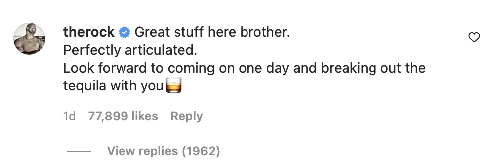 “Great stuff here brother,” the wrestler-turned-actor replied. “Perfectly articulated. Look forward to coming on one day and breaking out the tequila with you.”