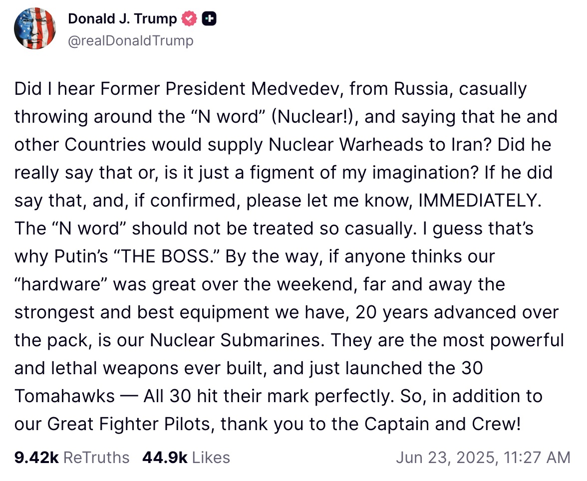 “Did I hear Former President Medvedev, from Russia, casually throwing around the ‘N word’ (Nuclear!), and saying that he and other Countries would supply Nuclear Warheads to Iran? Did he really say that or, is it just a figment of my imagination? If he did say that, and, if confirmed, please let me know, IMMEDIATELY,” began Trump in a furious Truth Social post. “The ‘N word’ should not be treated so casually. I guess that’s why Putin’s ‘THE BOSS.’ By the way, if anyone thinks our ‘hardware’ was great over the weekend, far and away the strongest and best equipment we have, 20 years advanced over the pack, is our Nuclear Submarines. They are the most powerful and lethal weapons ever built, and just launched the 30 Tomahawks — All 30 hit their mark perfectly. So, in addition to our Great Fighter Pilots, thank you to the Captain and Crew!”