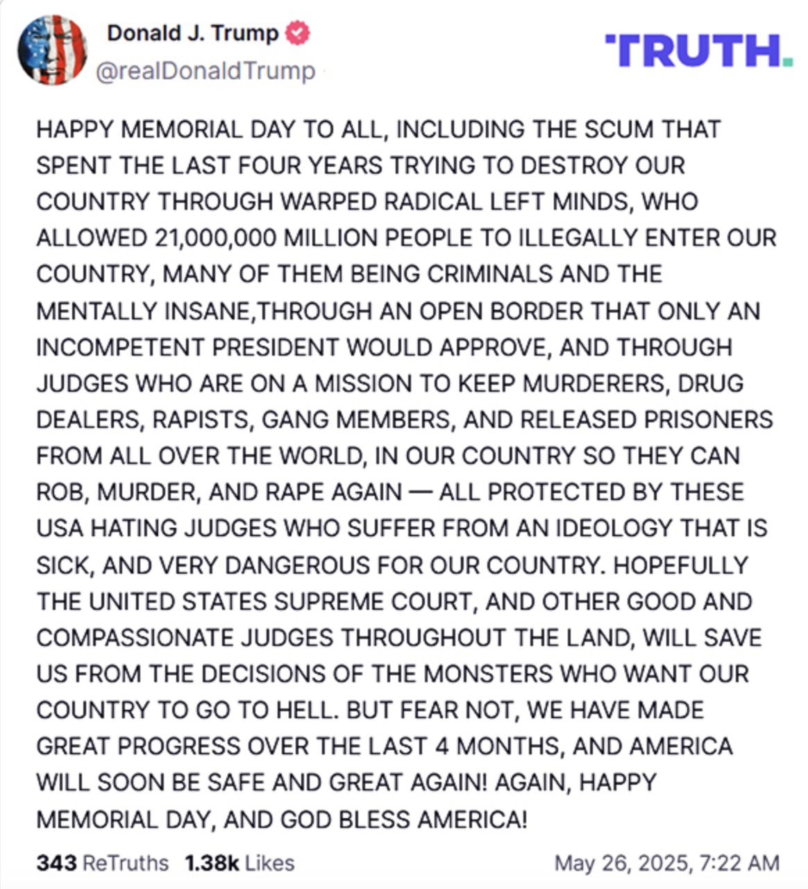 HAPPY MEMORIAL DAY TO ALL, INCLUDING THE SCUM THAT SPENT THE LAST FOUR YEARS TRYING TO DESTROY OUR COUNTRY THROUGH WARPED RADICAL LEFT MINDS, WHO ALLOWED 21,000,000 MILLION PEOPLE TO ILLEGALLY ENTER OUR COUNTRY, MANY OF THE BEING CRIMINALS AND THE MENTAO INSANE,THROUGH AN OPEN BORDER THAT ONLY AN INCOMPETENT PRESIDENT WOULD APPROVE, AND THROUGH JUDGES WHO ARE ON A MISSION TO KEEP MURDERERS, DRUG DEALERS, RAPISTS, GANG MEMBERS, AND RELEASED PRISONERS FROM ALL OVER THE WORLD, IN OUR COUNTRY SO THEY CAN ROB, MURDERERS, AND RAPE AGAIN, PROTECTED BY THESE USA HATING JUDGES WHO SUFFER FROM AN IDEOLOGY THAT IS SICK, AND VERY DANGEROUS FOR OUR COUNTRY. HOPEFULLY THE UNITED STATES SUPREME COURT, AND OTHER GOOD AND COMPASSIONATE JUDGES THROUGHOUT THE LAND, WILL SAVE US FROM THE DECISIONS OF THE MONSTERS WHO WANT OUR COUNTRY TO GO TO HELL. BUT FEAR NOT, WE HAVE MADE GREAT PROGRESS OVER THE LAST 4 MONTHS, AND AMERICA WILL SOON BE SAFE AND GREAT AGAIN! AGAIN, HAPPY MEMORIAL DAY, AND GOD BLESS AMERICA!
