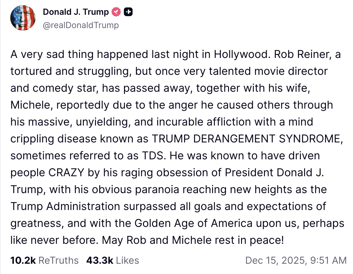 “A very sad thing happened last night in Hollywood. Rob Reiner, a tortured and struggling, but once very talented movie director and comedy star, has passed away, together with his wife, Michele, reportedly due to the anger he caused others through his massive, unyielding, and incurable affliction with a mind crippling disease known as TRUMP DERANGEMENT SYNDROME, sometimes referred to as TDS,” declared Trump on Truth Social. “He was known to have driven people CRAZY by his raging obsession of President Donald J. Trump, with his obvious paranoia reaching new heights as the Trump Administration surpassed all goals and expectations of greatness, and with the Golden Age of America upon us, perhaps like never before. May Rob and Michele rest in peace!”