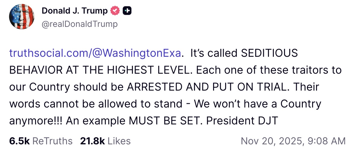“It’s called SEDITIOUS BEHAVIOR AT THE HIGHEST LEVEL. Each one of these traitors to our Country should be ARRESTED AND PUT ON TRIAL. Their words cannot be allowed to stand – We won’t have a Country anymore!!! An example MUST BE SET,” wrote Trump in one post before later suggesting that it was “SEDITIOUS BEHAVIOR, punishable by DEATH!”