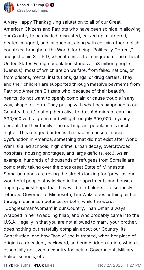 On Thanksgiving, the president celebrated the holiday by tearing into a pair of his political opponents, Rep. Ilhan Omar (D-MN) and Minnesota Governor Tim Walz (D-MN), the latter of whom he even went so far as to describe as being “seriously retarded.”