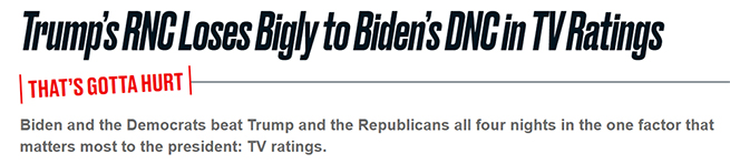 The TV ratings were higher for Democrats when comparing the conventions overall, and specifically comparing Biden’s acceptance speech with Trump’s.