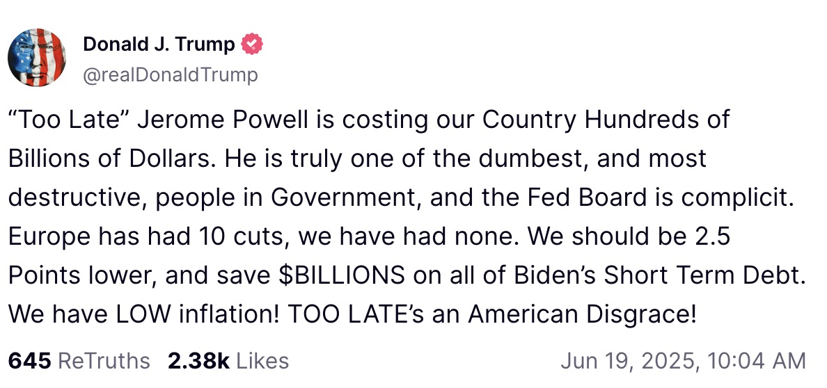 Calling him “‘Too Late’ Jerome Powell,” Trump focused his ire on the Fed chief in a tirade posted to his Truth Social platform:
