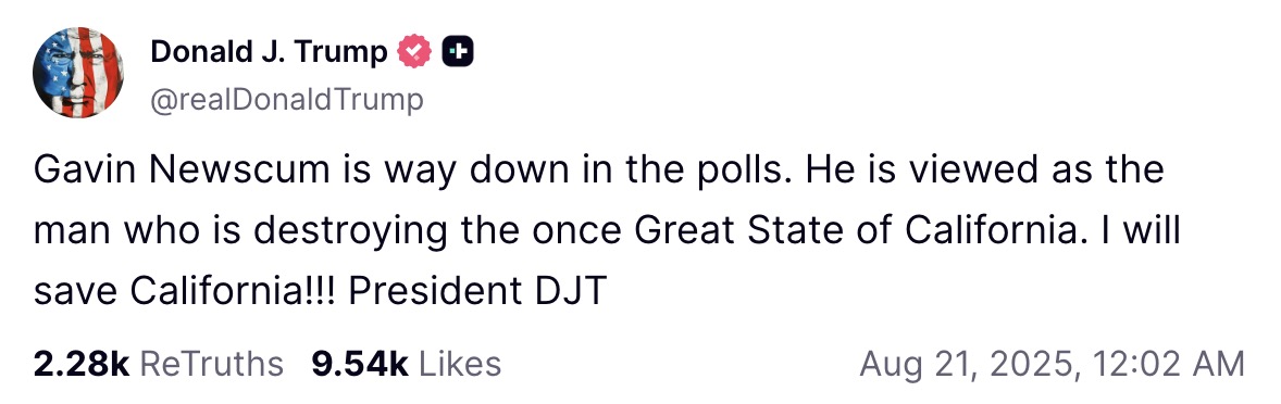 “Gavin Newscum is way down in the polls,” Trump said. “He is viewed as the man who is destroying the once Great State of California. I will save California!!! President DJT”