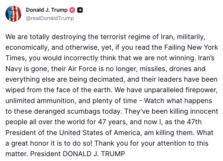 Trump Brags He’s ‘Totally Destroying’ Iran in Midnight Outburst Scorching NY Times: ‘You Would Incorrectly Think That We Are Not Winning’