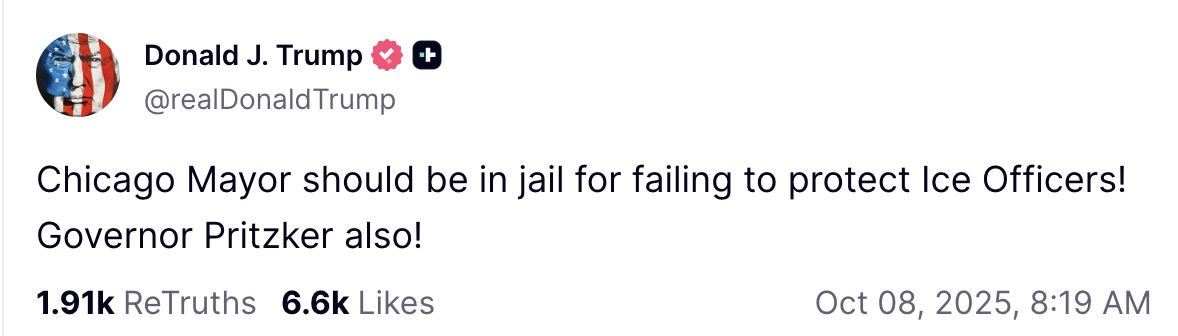 In a short and sweet Truth Social snipe on Wednesday, Trump said: Chicago Mayor should be in jail for failing to protect Ice Officers. Governor Pritzker also.”