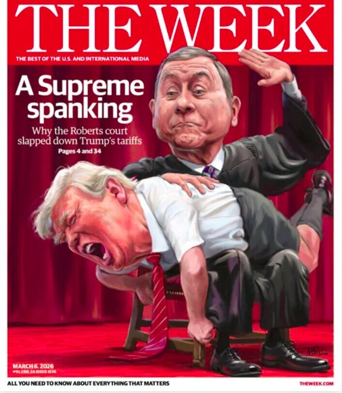 President Donald Trump was brutally mocked by the Friday edition of left-leaning magazine The Week with a cover depicting him getting spanked by Chief Justice John Roberts.