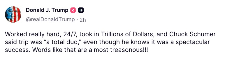 Worked really hard, 24/7, took in Trillions of Dollars, and Chuck Schumer said the trip was ‘a total dud,’ even though he knows it was a spectacular success. Words like that are almost treasonous!!!