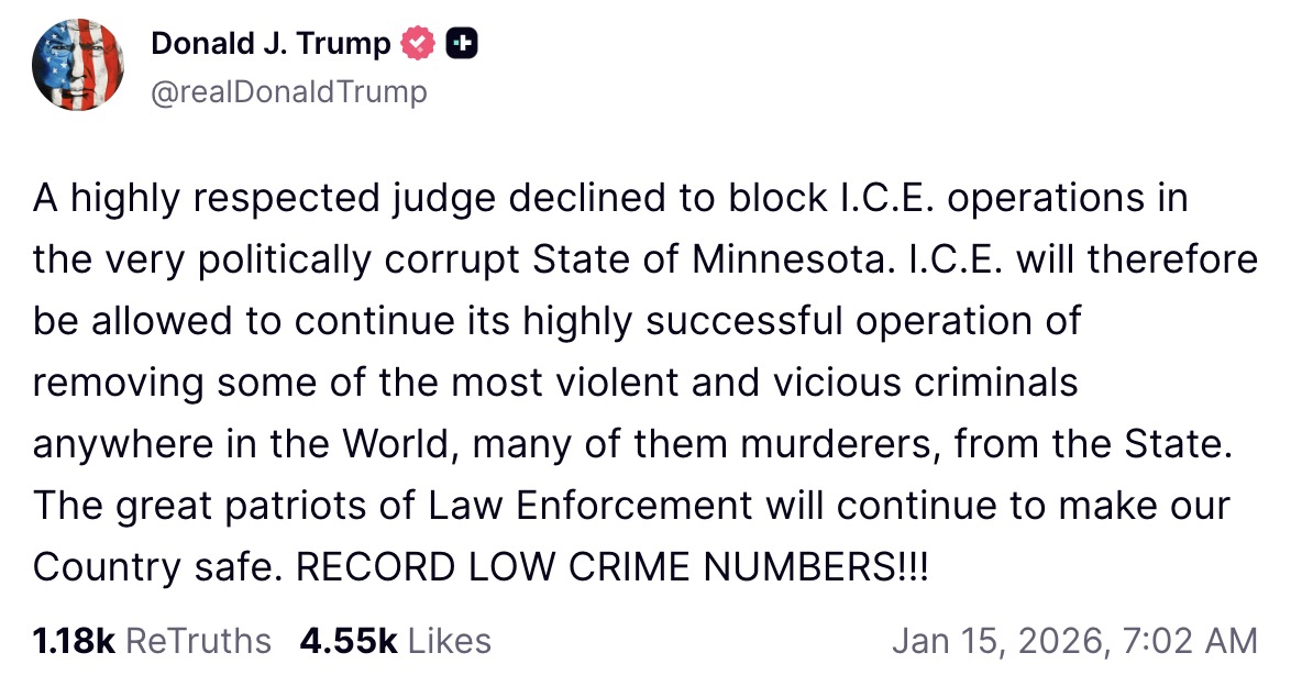 “A highly respected judge declined to block I.C.E. operations in the very politically corrupt State of Minnesota. I.C.E. will therefore be allowed to continue its highly successful operation of removing some of the most violent and vicious criminals anywhere in the World, many of them murderers, from the State,” Trump said in his post. “The great patriots of Law Enforcement will continue to make our Country safe. RECORD LOW CRIME NUMBERS!!!