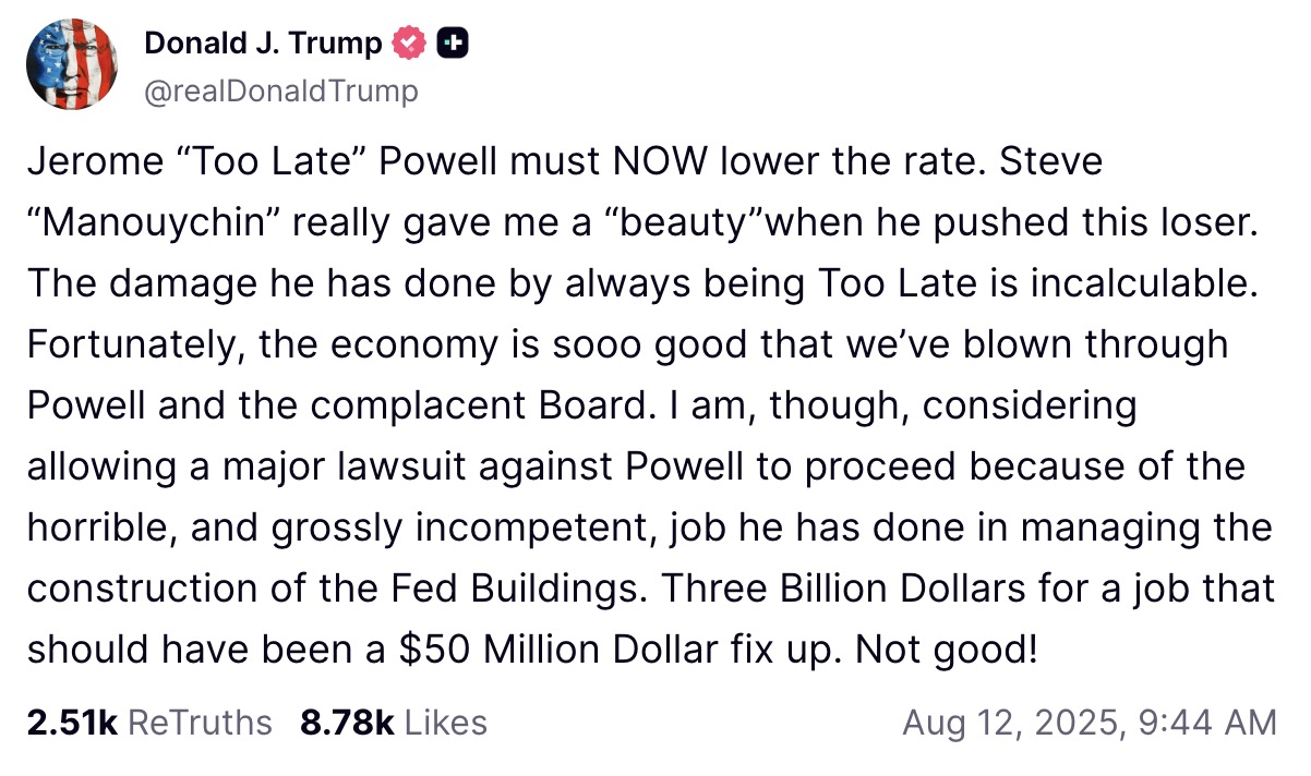 Jerome “Too Late” Powell must NOW lower the rate. Steve “Manouychin” really gave me a “beauty” when he pushed this loser. The damage he has done by always being Too Late is incalculable. Fortunately, the economy is sooo good that we’ve blown through Powell and the complacent Board. I am, though, considering allowing a major lawsuit against Powell to proceed because of the horrible, and grossly incompetent, job he has done in managing the construction of the Fed Buildings. Three Billion Dollars for a job that should have been a $50 Million Dollar fix up. Not good!
