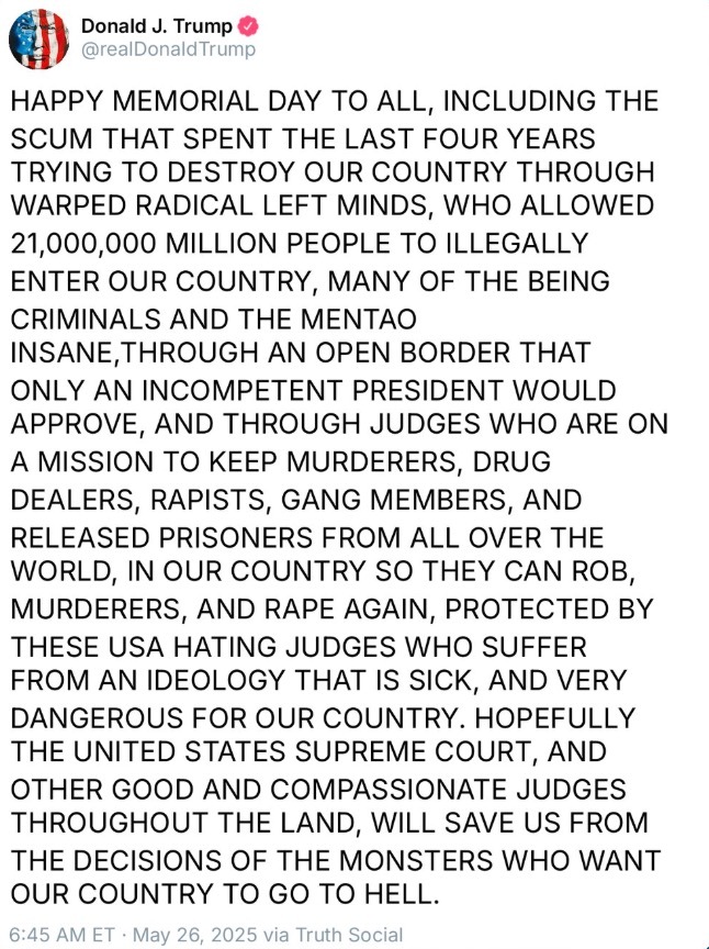 “HAPPY MEMORIAL DAY TO ALL, INCLUDING THE SCUM THAT SPENT THE LAST FOUR YEARS TRYING TO DESTROY OUR COUNTRY THROUGH WARPED RADICAL LEFT MINDS, WHO ALLOWED 21,000,000 MILLION PEOPLE TO ILLEGALLY ENTER OUR COUNTRY, MANY OF THE BEING CRIMINALS AND THE MENTAO INSANE,THROUGH AN OPEN BORDER THAT ONLY AN INCOMPETENT PRESIDENT WOULD APPROVE, AND THROUGH JUDGES WHO ARE ON A MISSION TO KEEP MURDERERS, DRUG DEALERS, RAPISTS, GANG MEMBERS, AND RELEASED PRISONERS FROM ALL OVER THE WORLD, IN OUR COUNTRY SO THEY CAN ROB, MURDERERS, AND RAPE AGAIN, PROTECTED BY THESE USA HATING JUDGES WHO SUFFER FROM AN IDEOLOGY THAT IS SICK, AND VERY DANGEROUS FOR OUR COUNTRY. HOPEFULLY THE UNITED STATES SUPREME COURT, AND OTHER GOOD AND COMPASSIONATE JUDGES THROUGHOUT THE LAND, WILL SAVE US FROM THE DECISIONS OF THE MONSTERS WHO WANT OUR COUNTRY TO GO TO HELL.”