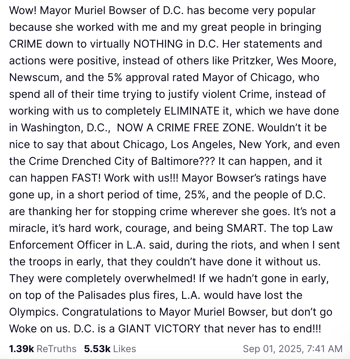 Wow! Mayor Muriel Bowser of D.C. has become very popular because she worked with me and my great people in bringing CRIME down to virtually NOTHING in D.C. Her statements and actions were positive, instead of others like Pritzker, Wes Moore, Newscum, and the 5% approval rated Mayor of Chicago, who spend all of their time trying to justify violent Crime, instead of working with us to completely ELIMINATE it, which we have done in Washington, D.C., NOW A CRIME FREE ZONE. Wouldn’t it be nice to say that about Chicago, Los Angeles, New York, and even the Crime Drenched City of Baltimore??? It can happen, and it can happen FAST! Work with us!!! Mayor Bowser’s ratings have gone up, in a short period of time, 25%, and the people of D.C. are thanking her for stopping crime wherever she goes. It’s not a miracle, it’s hard work, courage, and being SMART. The top Law Enforcement Officer in L.A. said, during the riots, and when I sent the troops in early, that they couldn’t have done it without us. They were completely overwhelmed! If we hadn’t gone in early, on top of the Palisades plus fires, L.A. would have lost the Olympics. Congratulations to Mayor Muriel Bowser, but don’t go Woke on us. D.C. is a GIANT VICTORY that never has to end!!!