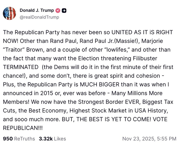 Other than Rand Paul, Rand Paul Jr. (Massie!), Marjorie “Traitor” Brown, and a couple of other “lowlifes,” and other than the fact that many want the Election threatening Filibuster TERMINATED (the Dems will do it in the first minute of their first chance!), and some don’t, there is a great spirit and cohesion — Plus, the Republican Party is MUCH BIGGER than it was when I announced in 2015 or, ever was before — Many Millions More Members! We now have the Strongest Border EVER, Biggest Tax Cuts, the Best Economy, Highest Stock Market in USA History, and sooo much more. BUT, THE BEST IS YET TO COME! VOTE REPUBLICAN!!!