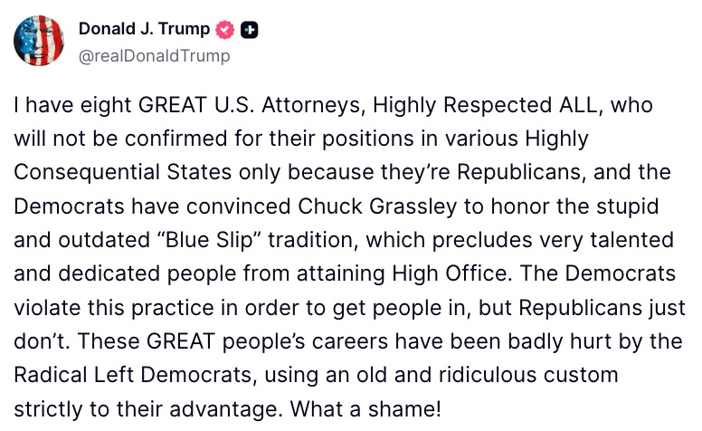 I have eight GREAT U.S. Attorneys, Highly Respected ALL, who will not be confirmed for their positions in various Highly Consequential States only because they’re Republicans, and the Democrats have convinced Chuck Grassley to honor the stupid and outdated “Blue Slip” tradition, which precludes very talented and dedicated people from attaining High Office. The Democrats violate this practice in order to get people in, but Republicans just don’t. These GREAT people’s careers have been badly hurt by the Radical Left Democrats, using an old and ridiculous custom strictly to their advantage. What a shame!