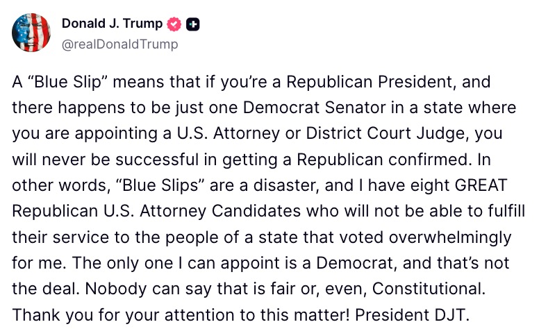 A “Blue Slip” means that if you’re a Republican President, and there happens to be just one Democrat Senator in a state where you are appointing a U.S. Attorney or District Court Judge, you will never be successful in getting a Republican confirmed. In other words, “Blue Slips” are a disaster, and I have eight GREAT Republican U.S. Attorney Candidates who will not be able to fulfill their service to the people of a state that voted overwhelmingly for me. The only one I can appoint is a Democrat, and that’s not the deal. Nobody can say that is fair or, even, Constitutional. Thank you for your attention to this matter! President DJT.