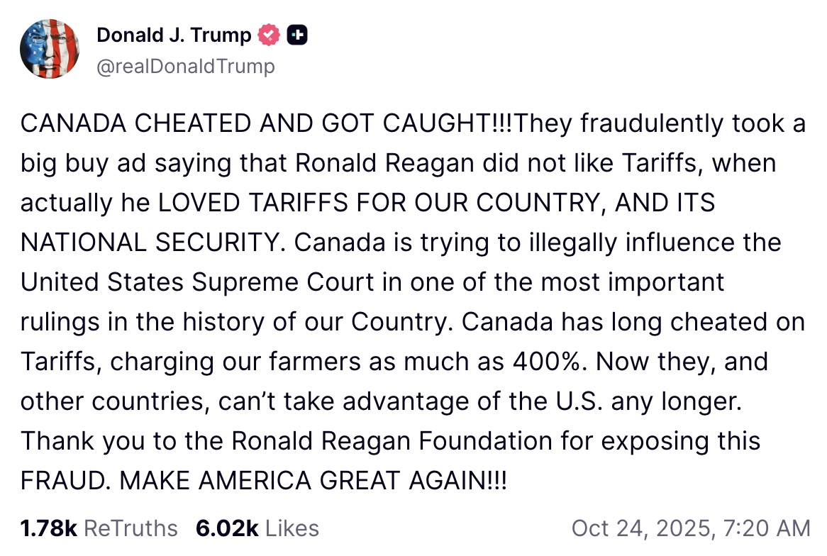 The Ronald Reagan Foundation has just announced that Canada has fraudulently used an advertisement, which is FAKE, featuring Ronald Reagan speaking negatively about Tariffs. The ad was for $75,000. They only did this to interfere with the decision of the U.S. Supreme Court, and other courts. TARIFFS ARE VERY IMPORTANT TO THE NATIONAL SECURITY, AND ECONOMY, OF THE U.S.A. Based on their egregious behavior, ALL TRADE NEGOTIATIONS WITH CANADA ARE HEREBY TERMINATED. Thank you for your attention to this matter! President DJT