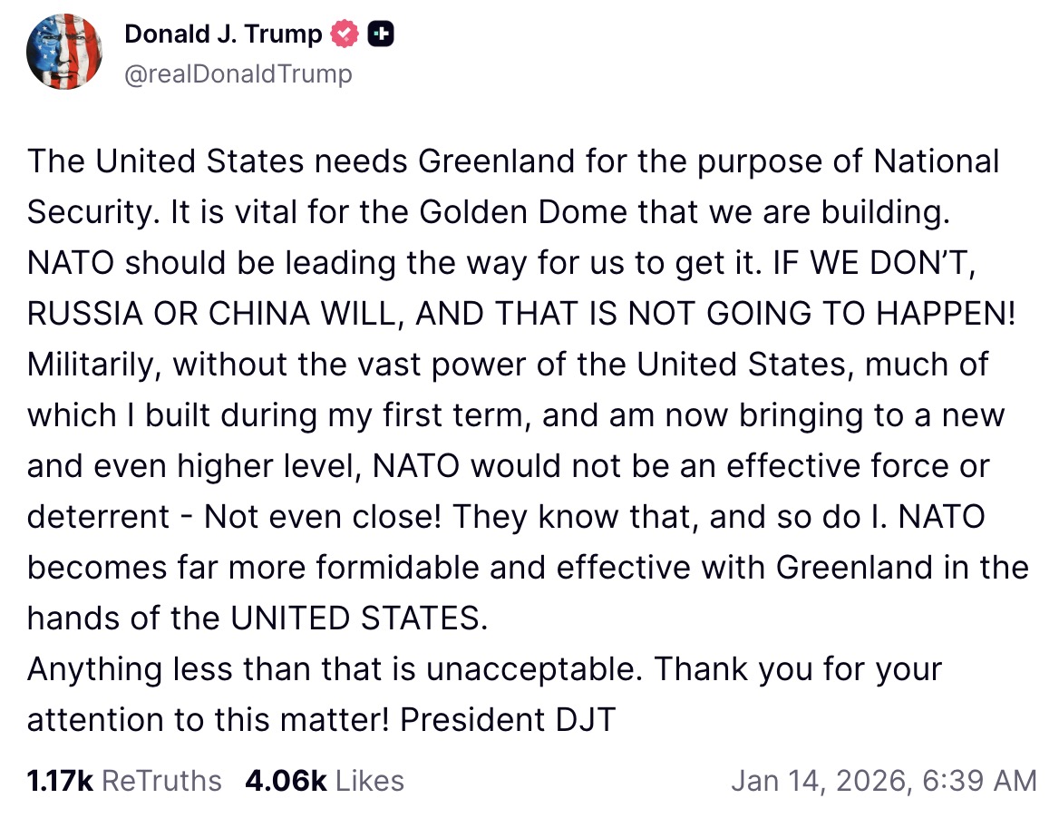 “The United States needs Greenland for the purpose of National Security. It is vital for the Golden Dome that we are building. NATO should be leading the way for us to get it. IF WE DON’T, RUSSIA OR CHINA WILL, AND THAT IS NOT GOING TO HAPPEN!”