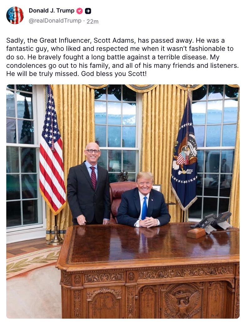 Trump Remembers Scott Adams, ‘Who Liked and Respected Me When It Wasn’t Fashionable’