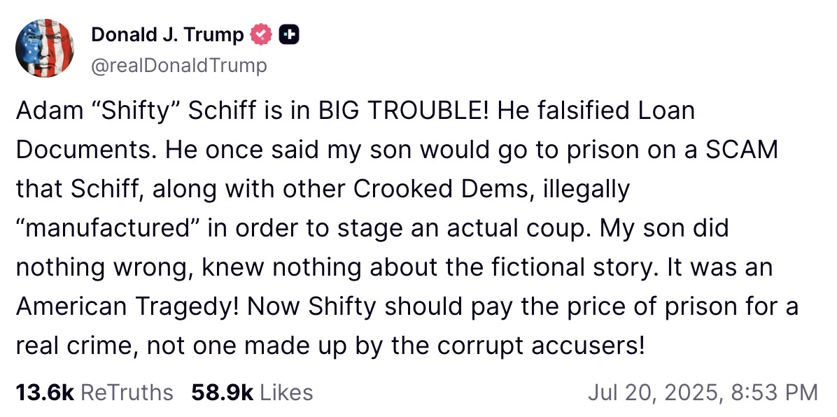 In a fiery Truth Social post on Sunday, the president accused Schiff of orchestrating a “SCAM” against his son and tripled down on claims the senator “falsified loan documents”: